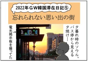 早くも滞在記シリーズ第5話となりました。いったい何話まで続くのでしょう。 バスがいつ到着するか表示されていて便利な電光掲示板。その後ろには金曜ロードショー初代OPを彷彿とさせる美しい夕日が映りこんでい … 続きを読む 2022年GW韓国滞在日記⑤